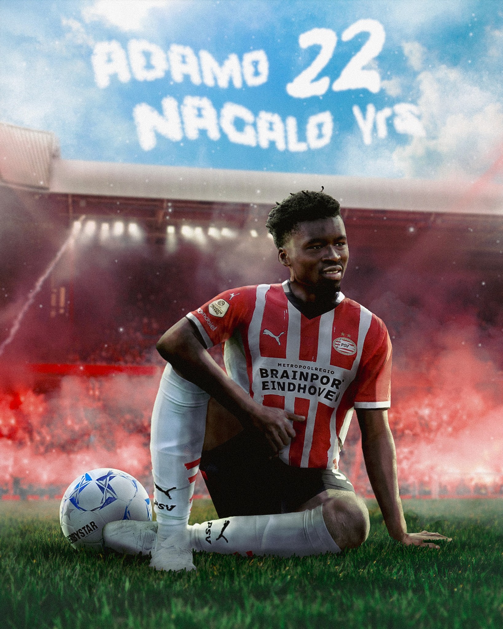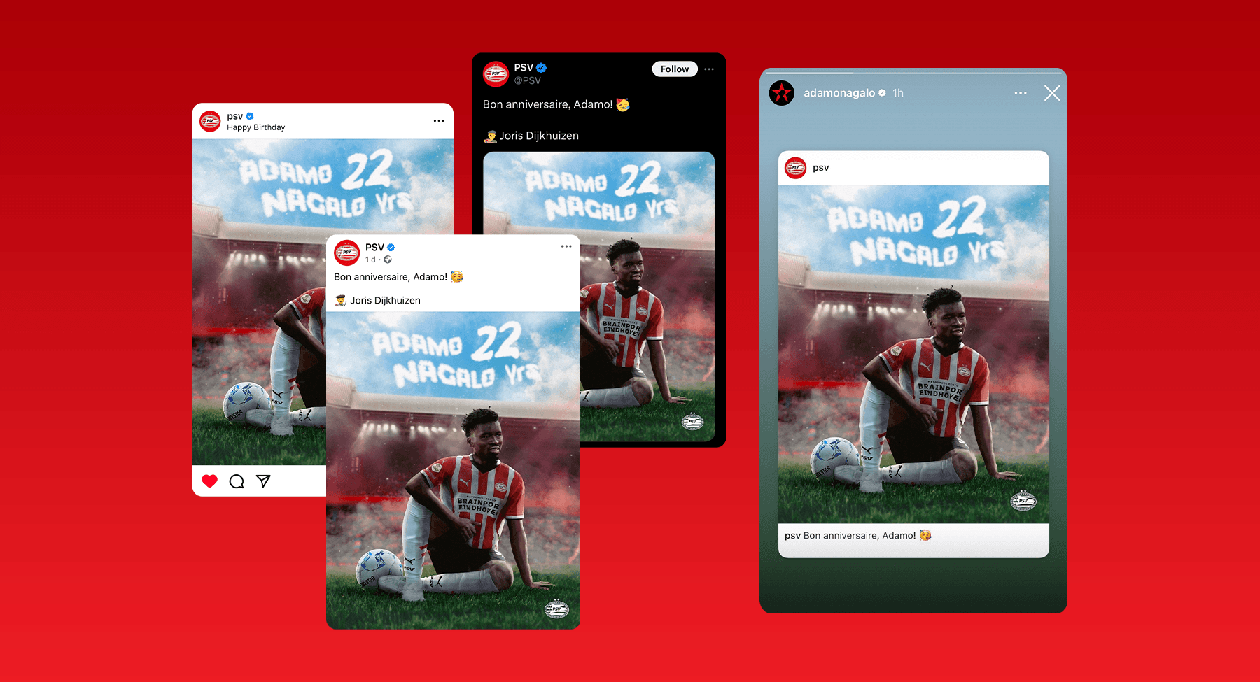PSV Eindhoven is one of the leading football clubs in the Netherlands. For their 2024/2025 birthday campaign, I designed a custom visual for defender Adamo Nagalo, creating a concept that celebrates his arrival at the club and his 22nd birthday while staying true to PSV’s strong visual identity.