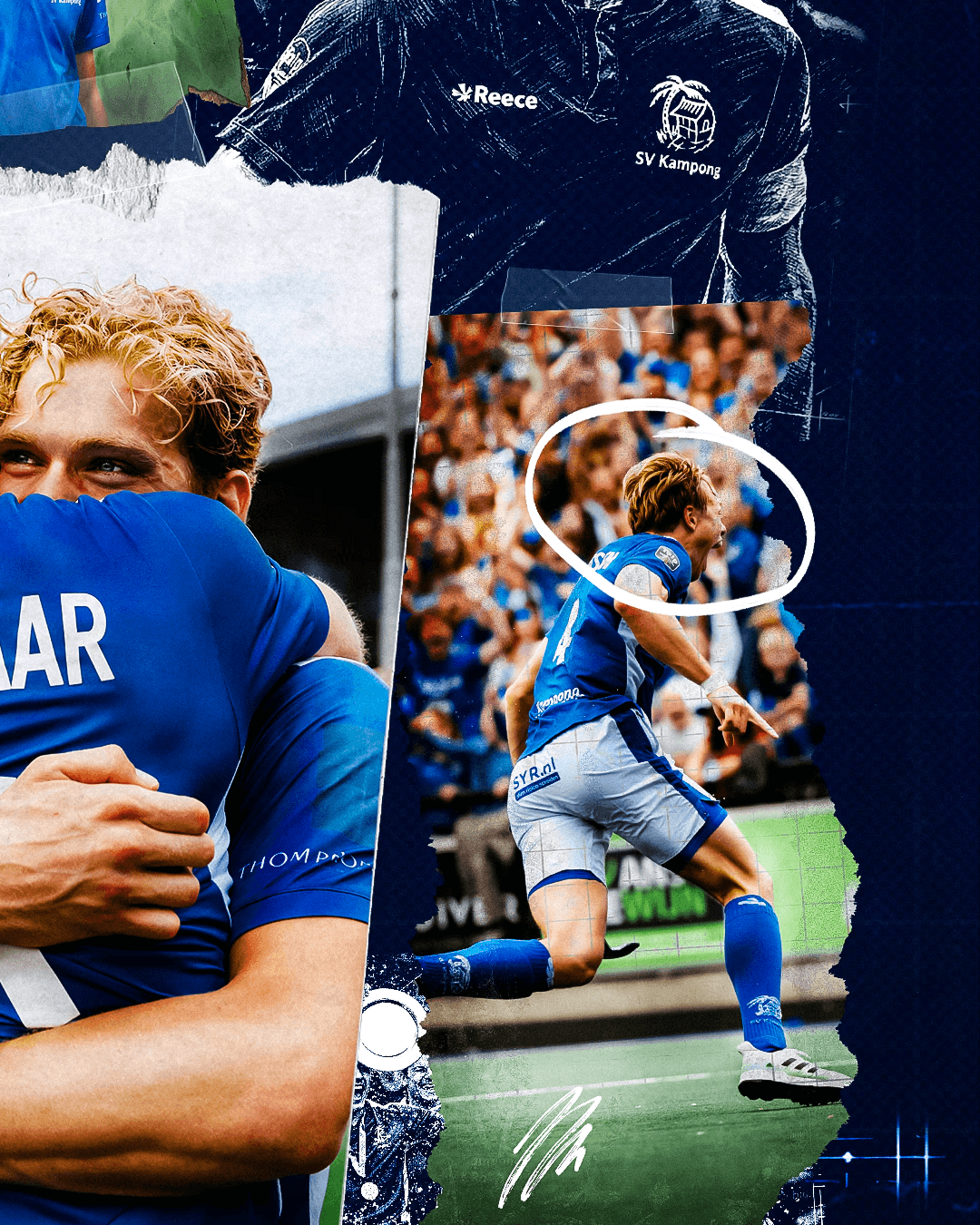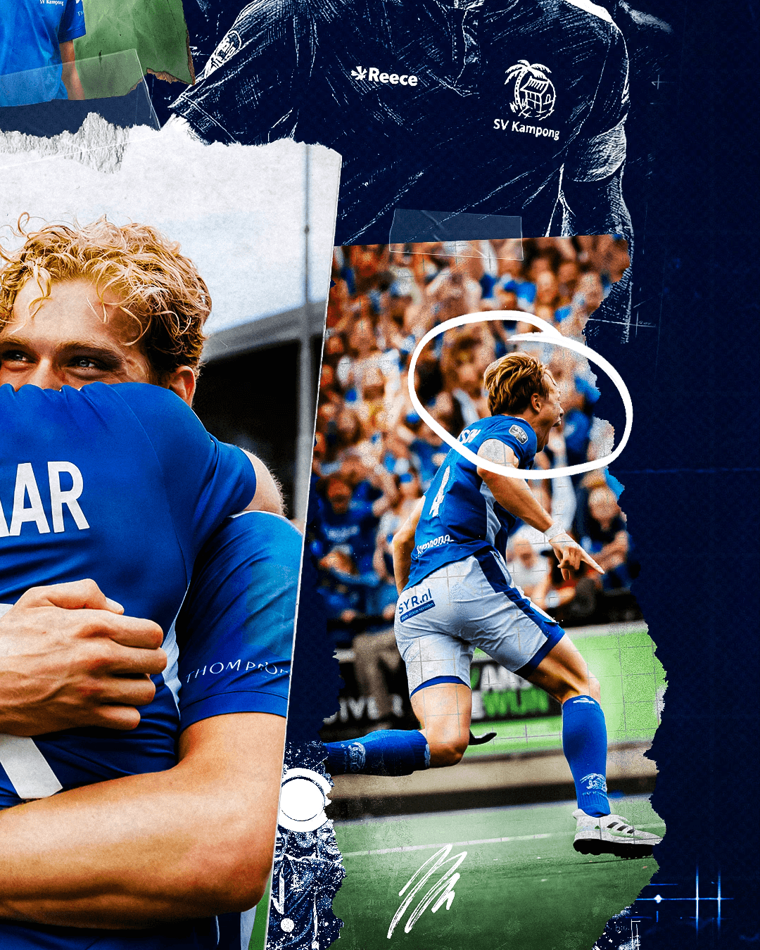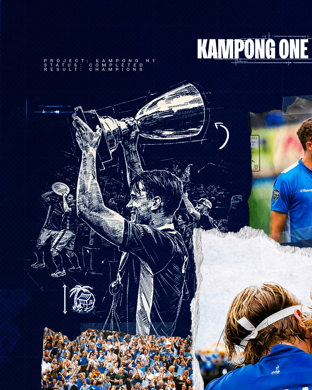 The artwork translates the story of a championship season into a single visual identity. By combining documentary storytelling with a blueprint-inspired design language, the piece reflects the preparation, teamwork and defining moments that led SV Kampong to the title.